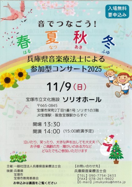 11月9日(日) 宝塚市立文化施設ソリオホールにおいて、兵庫県音楽療法士による参加型コンサート2025「音でつなごう!春 夏 秋 冬」が行われます。季節ごとの歌や音楽、さまざまな楽器を使って、みなさまと一緒に楽しみたく思っております。多くの方のご来場をお待ちしております。(申し込み締め切り10/31)